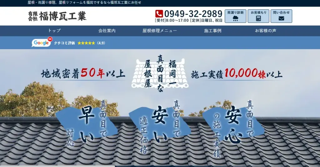 | サービス内容 | 葺き替え、カバー工法、屋根塗装、雨漏り修理など |