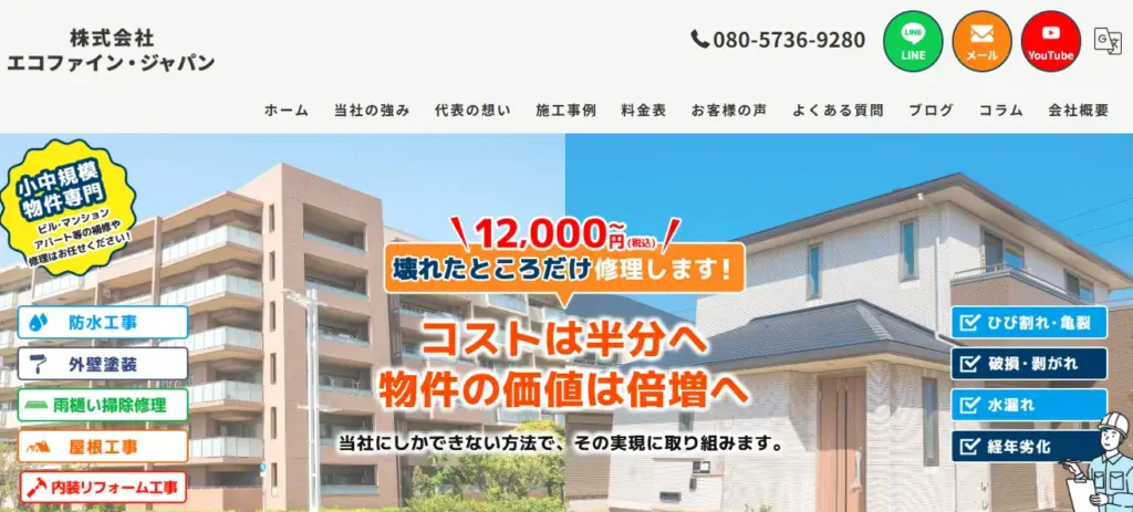 | サービス内容 | 防水工事、外壁塗装、屋根工事、雨どい工事など |