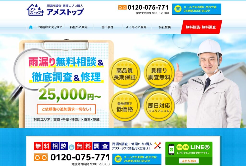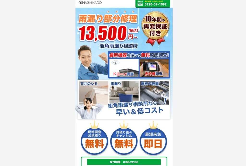 深夜・早朝でも電話相談が可能なので、急な雨漏りトラブルの際に頼りになります。
