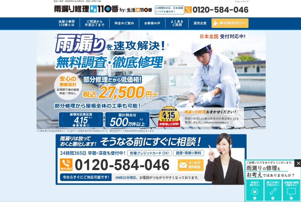 雨漏り修理を含め、運営会社への累計問い合わせ数は500万件以上です。部分修理にも対応しており、修理費用が27,500円~とリーズナブルで、最短30分程度で現地調査に来てもらえます。