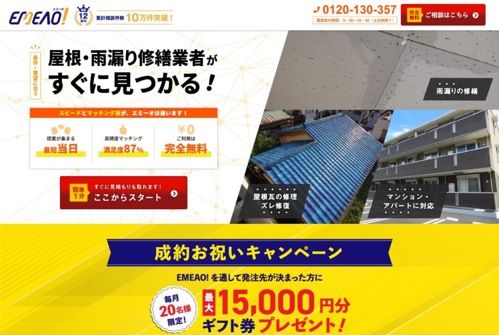 EMEAOは、累計相談件数10万件以上の雨漏り修理業者紹介サービスです。
