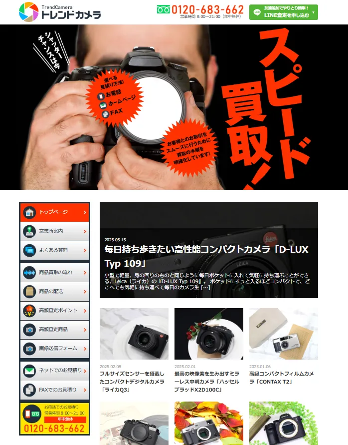 買取品目フィルムカメラ、コンパクトカメラ、レンズ、一眼レフカメラ、二眼レフカメラ、カメラアクセサリ、レンジファインダー、デジカメ、ビデオカメラ、三脚